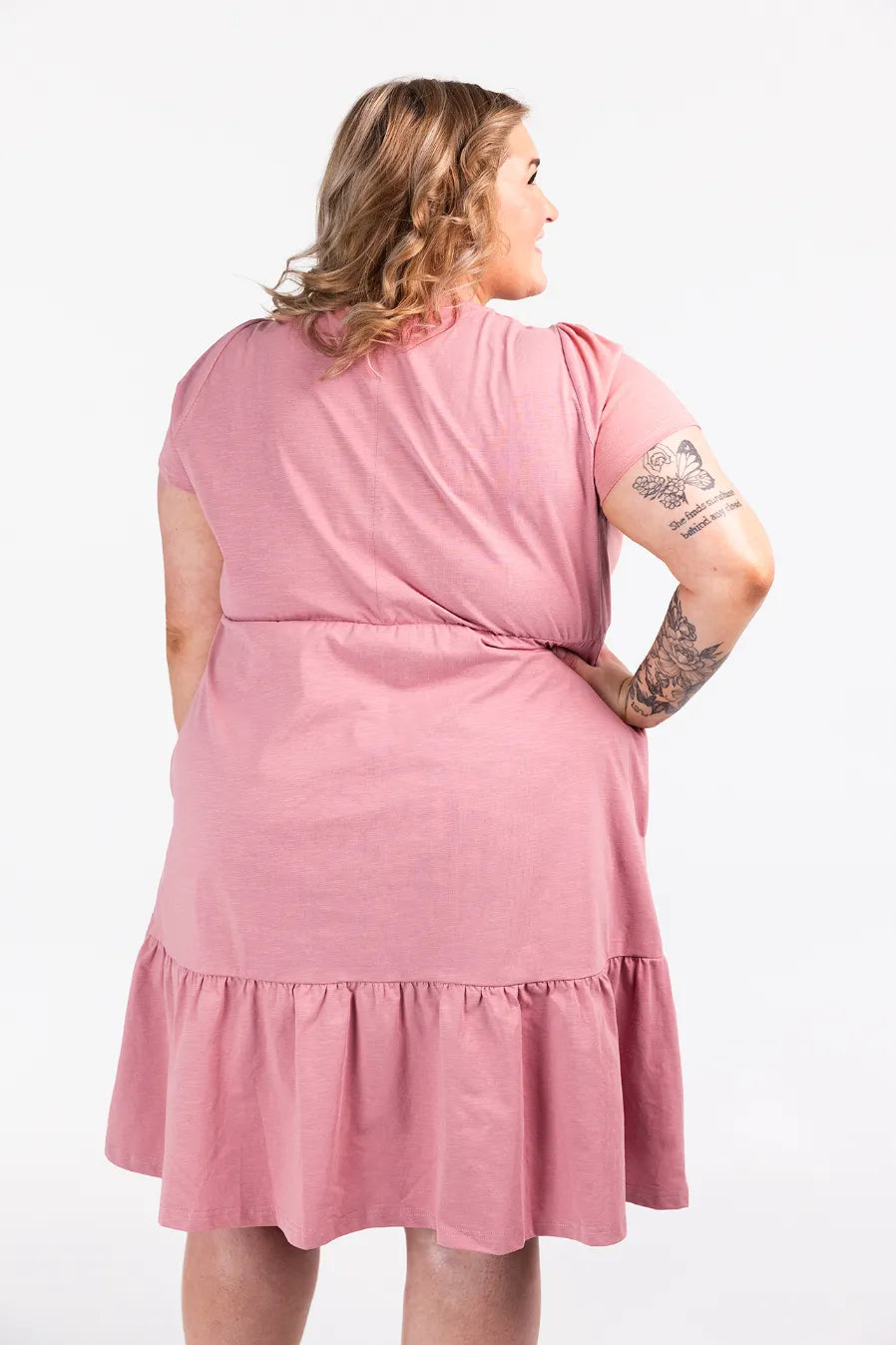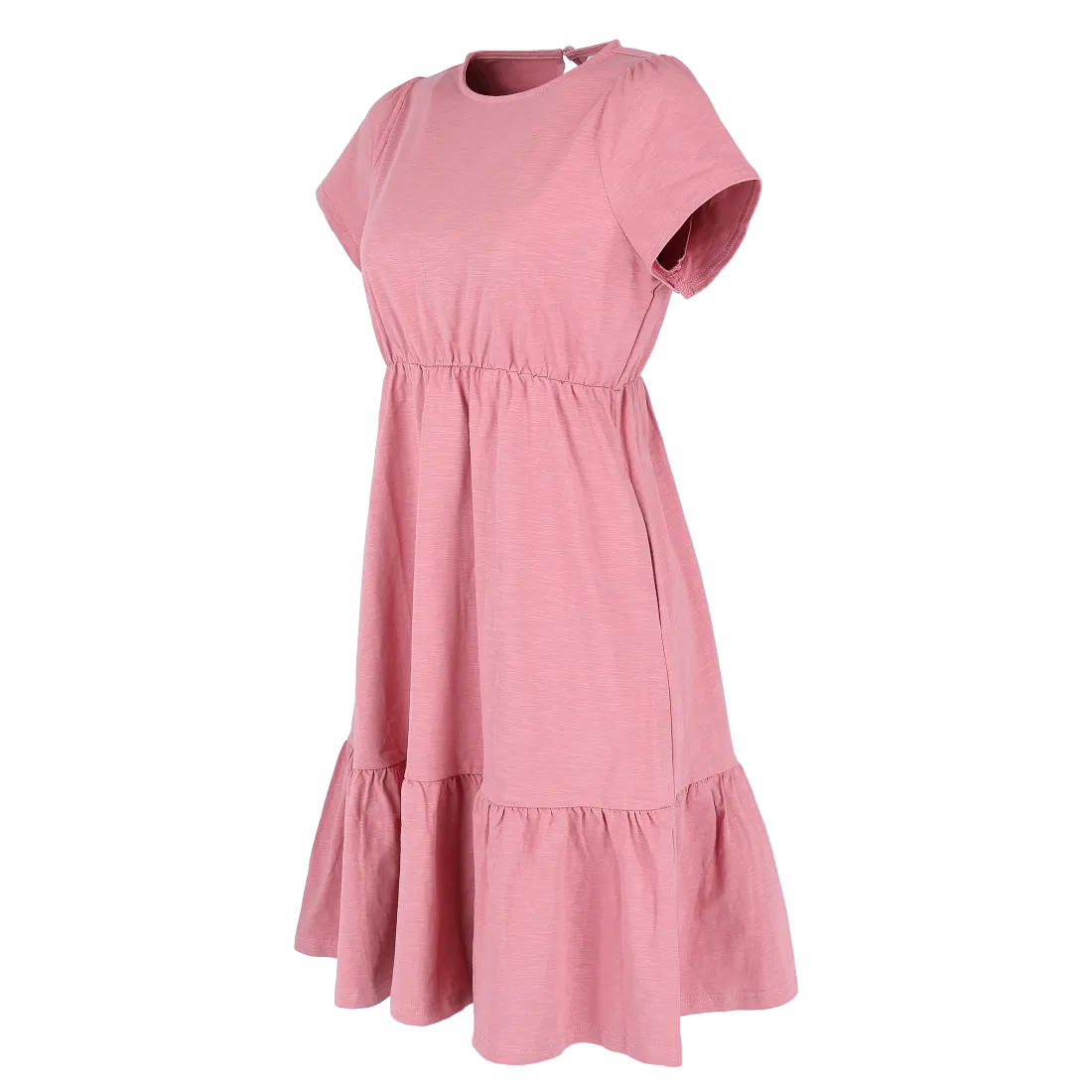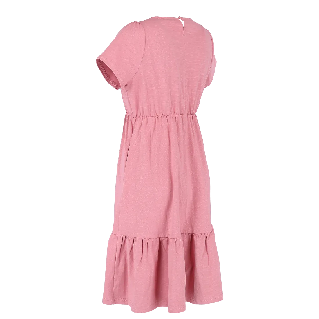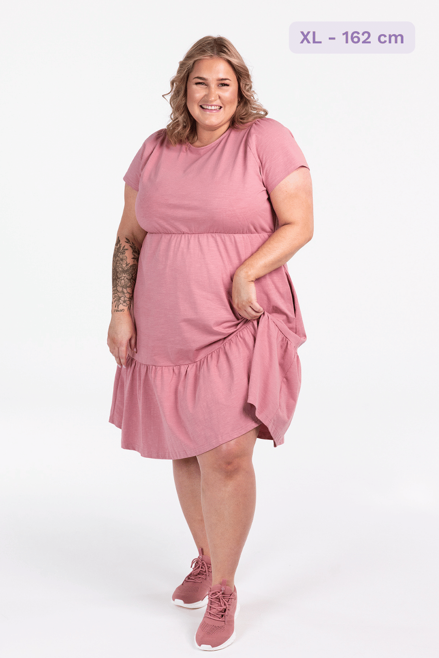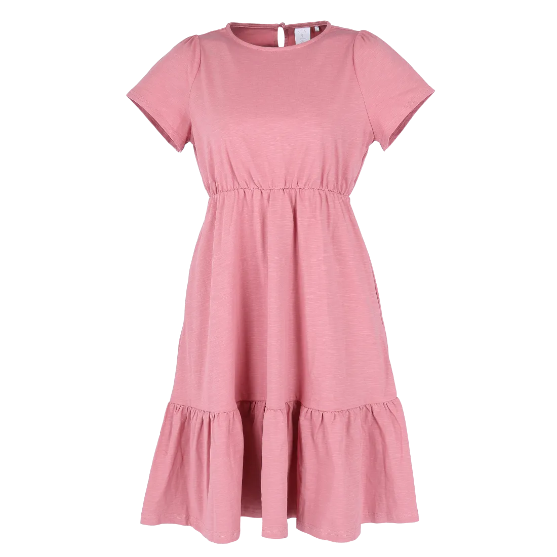 Denne kjolen har en avslappet og feminin stil, passer så godt til både hverdagsbruk og uformelle anledninger. Den er myk og behagelig, som gir en luftig og komfortabel følelse gjennom hele dagen. Kjolen har korte ermer, rund hals og en innsvinget midje med strikk som fremhever figuren på en naturlig måte. Skjørtdelen avsluttes med en bred volang som gir ekstra bevegelse og en flatterende passform.