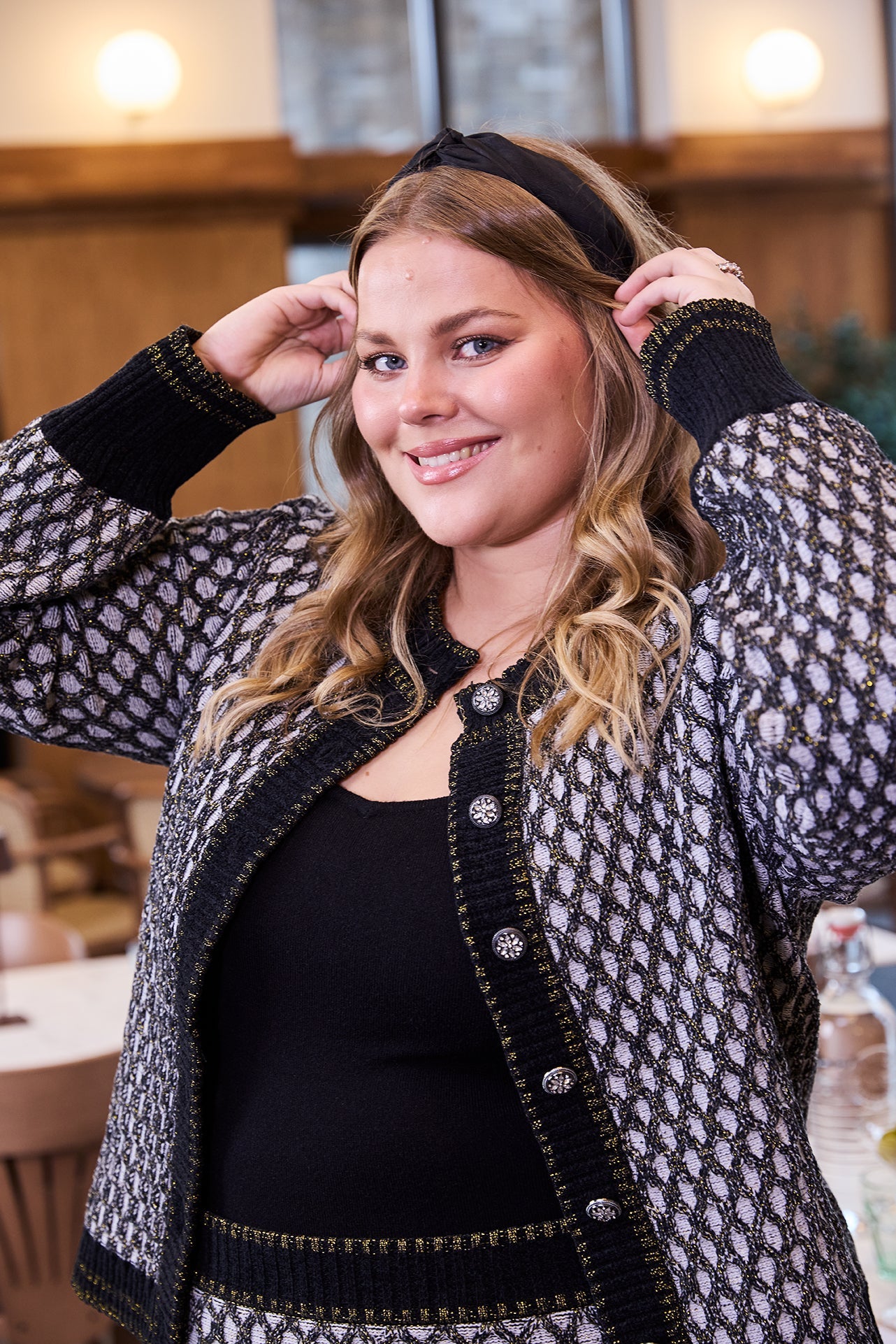Mønstret strikkejakke i sort og hvitt med innslag av metallfiber for en diskré glittereffekt. Jakken har rund hals, knappelukking foran og lange ermer. Ribbestrikkede kanter gir en strukturert og komfortabel passform. En allsidig jakke som løfter både enkle og mer pyntede antrekk. Passer veldig godt med matchende Eva skjørt og topp.