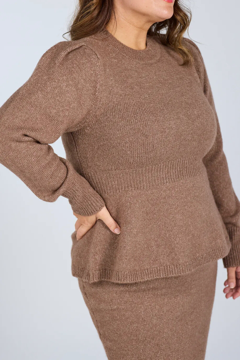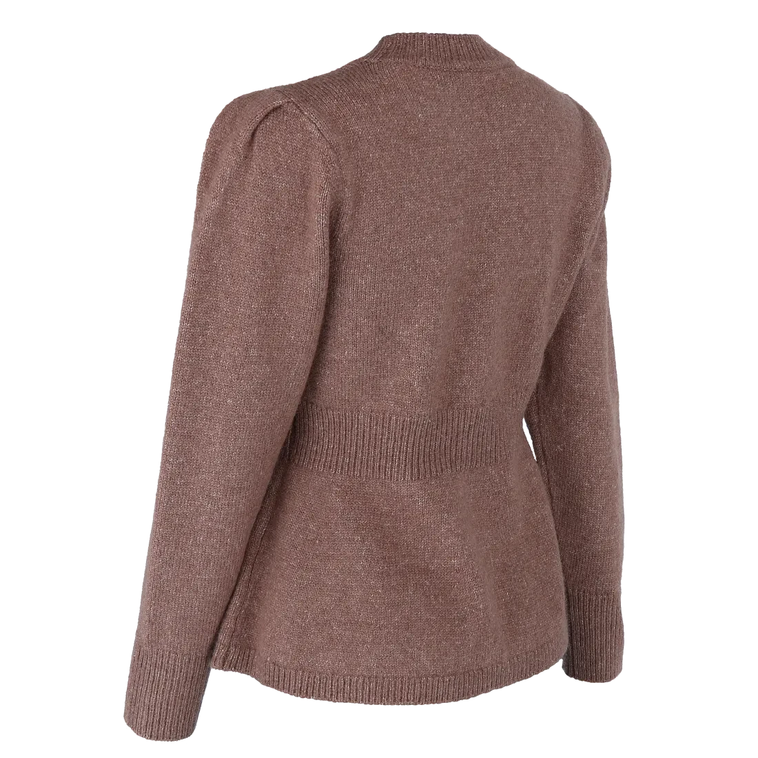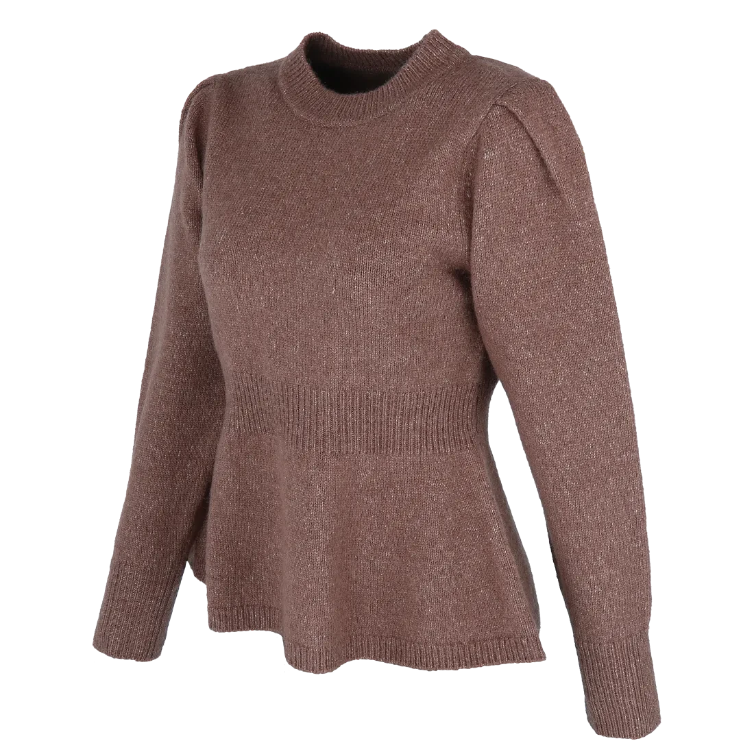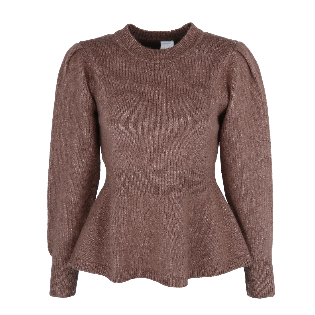 Denne strikkegenseren har et feminint og flatterende snitt med peplumform som gir en markert midje og lett utsving nederst. Den har rund hals, lange ermer og diskrete puffdetaljer på skuldrene. Ribbestrikkede partier ved hals, ermer og midje bidrar til en behagelig passform og fin struktur i designet.