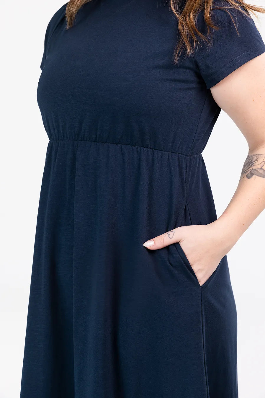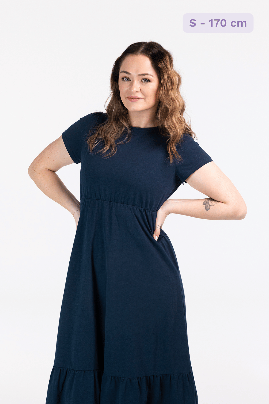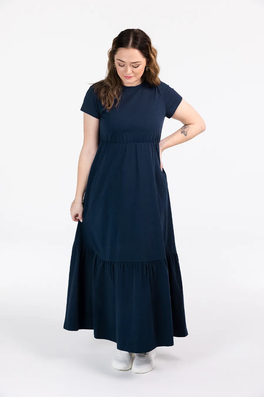 Denne maxikjolen har en avslappet og feminin stil, passer så godt til både hverdagsbruk og uformelle anledninger. Den er myk og behagelig, som gir en luftig og komfortabel følelse gjennom hele dagen. Kjolen har korte ermer, rund hals og en innsvinget midje med strikk som fremhever figuren på en naturlig måte. Den lange skjørtedelen avsluttes med en bred volang som gir ekstra bevegelse og en flatterende passform.