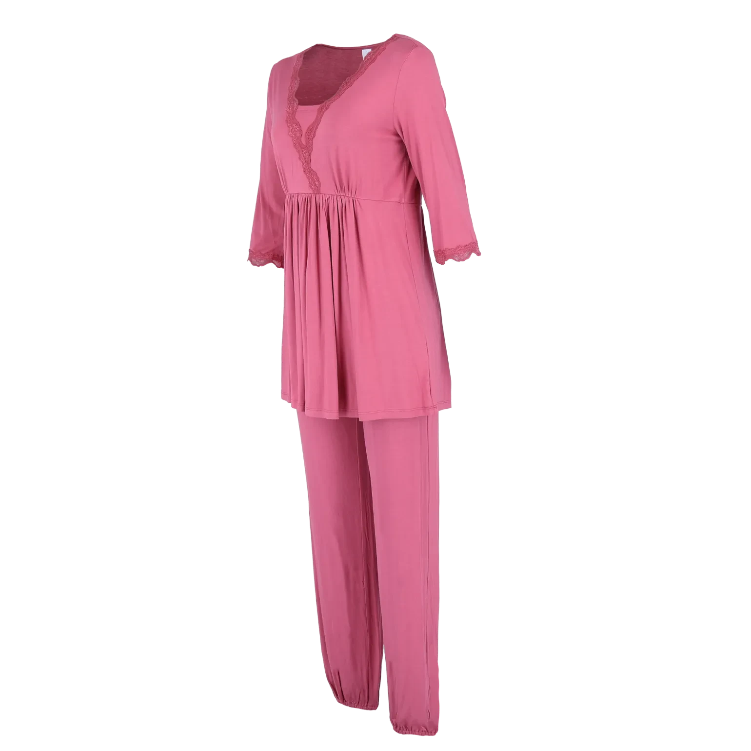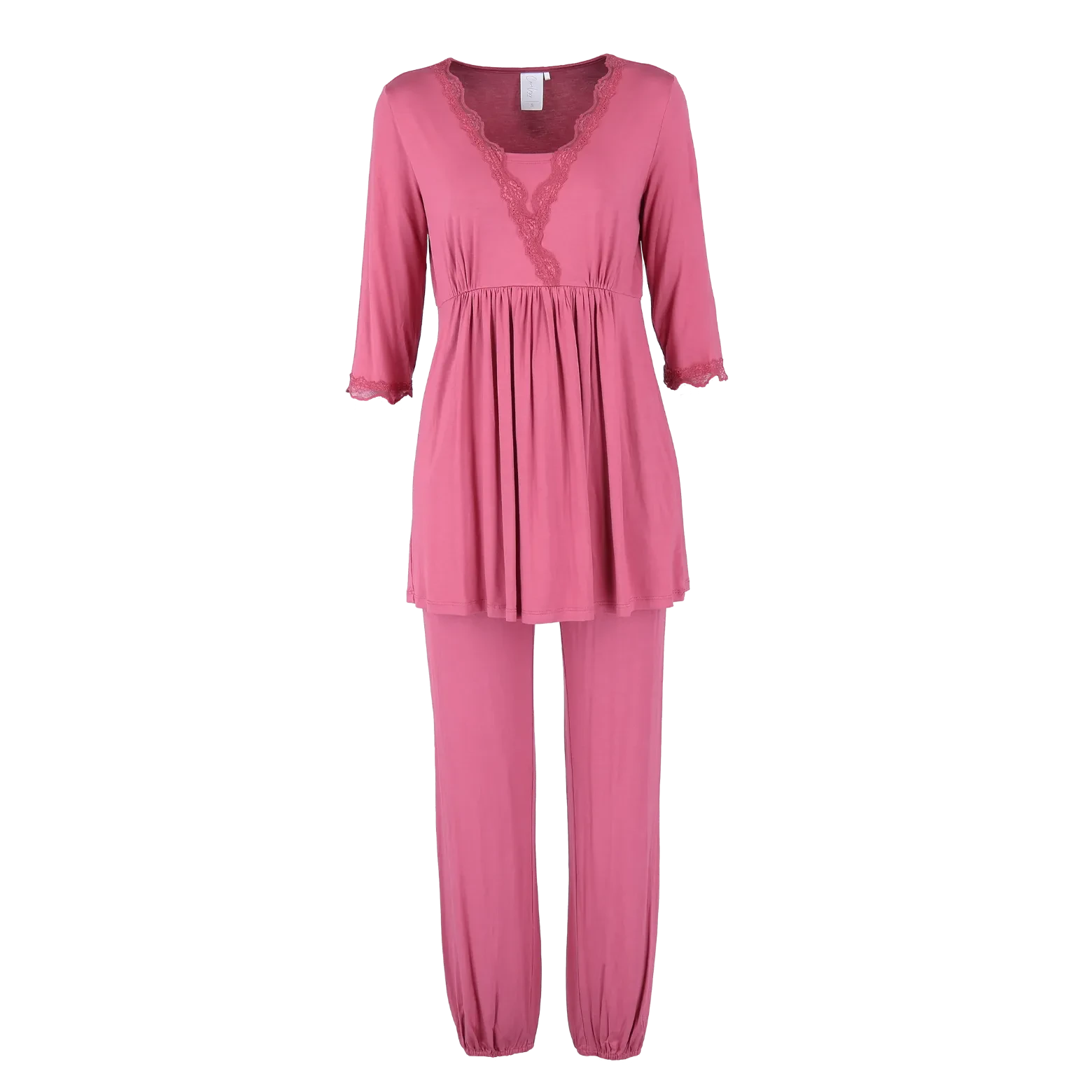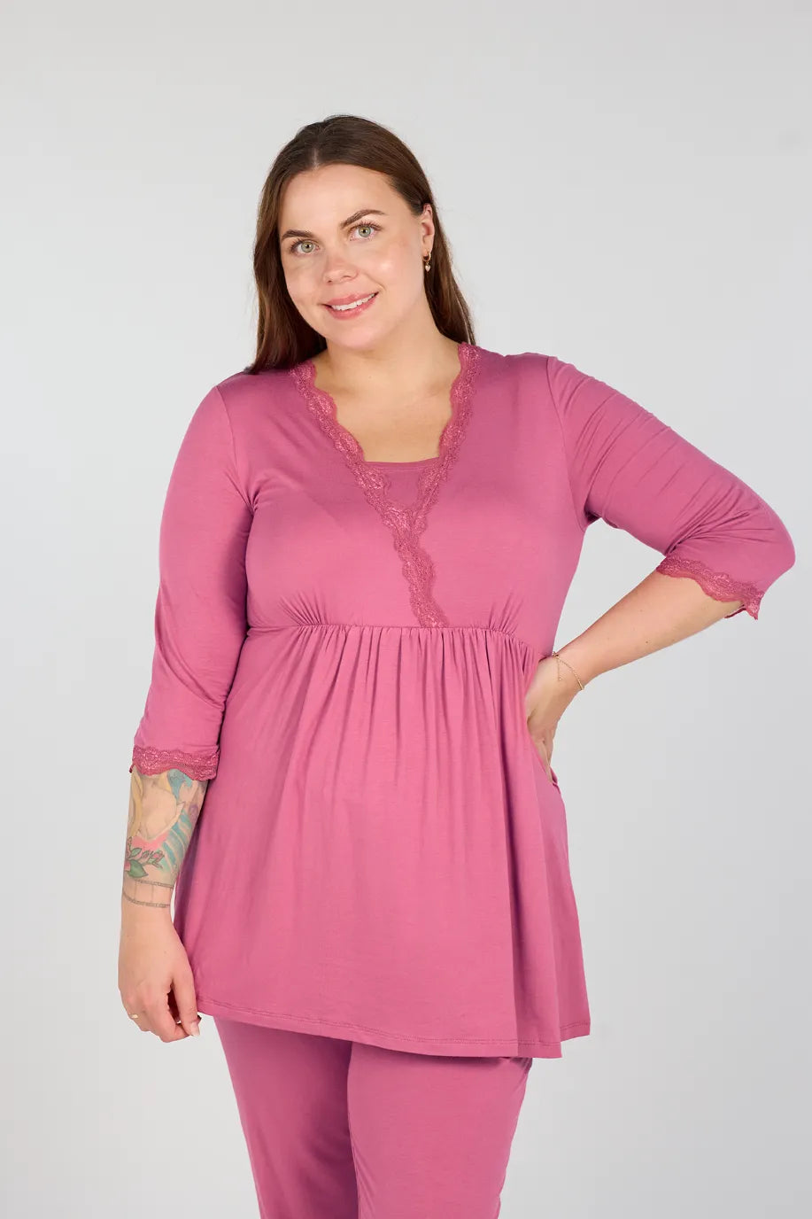 Tora pyjamas er supermyk og behagelig, perfekt for late dager hjemme. Den har en bukse med bred strikk i livet og fine blondedetaljer i samme farge som stoffet. Laget i myk viskose, og passer også for gravide og ammende.