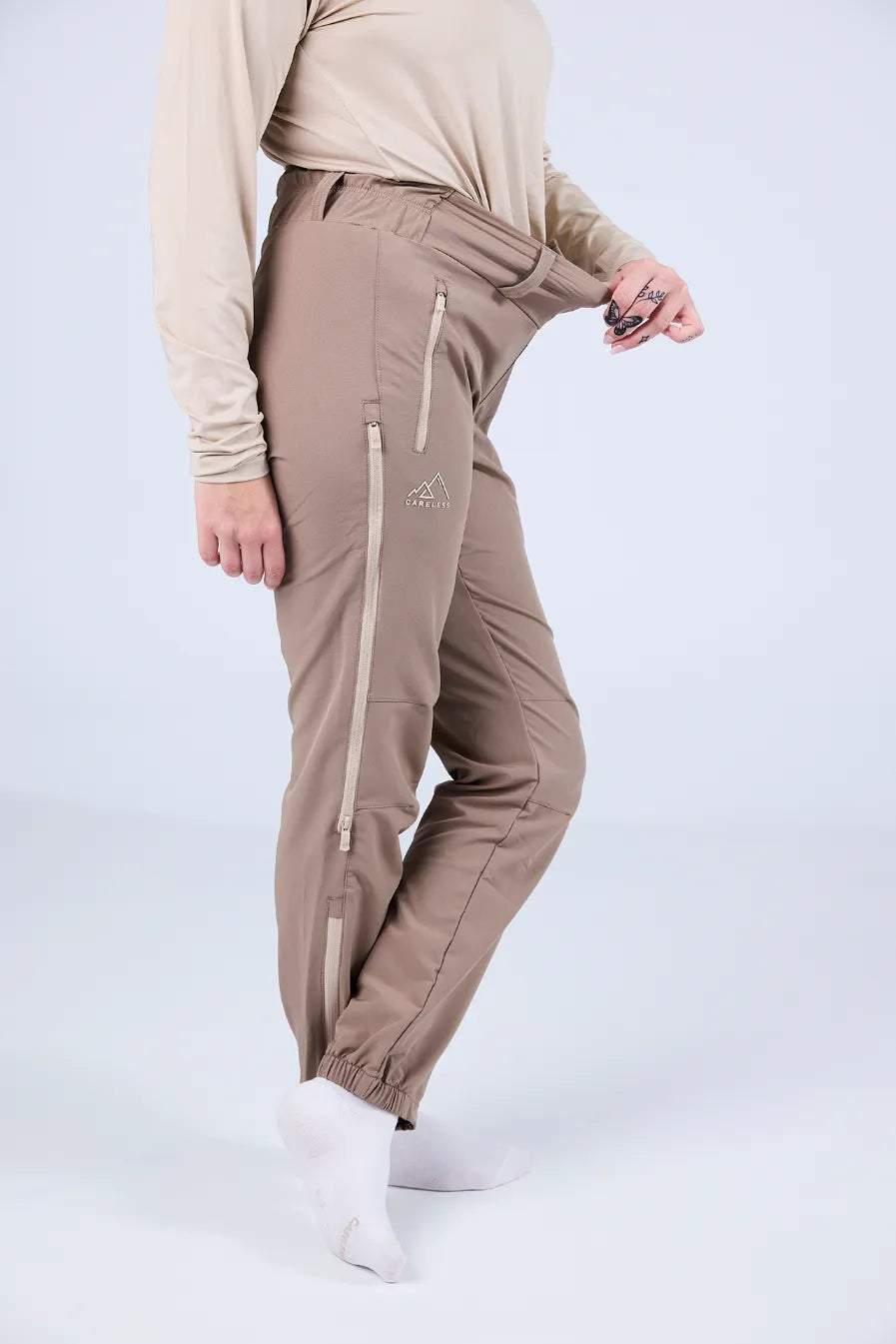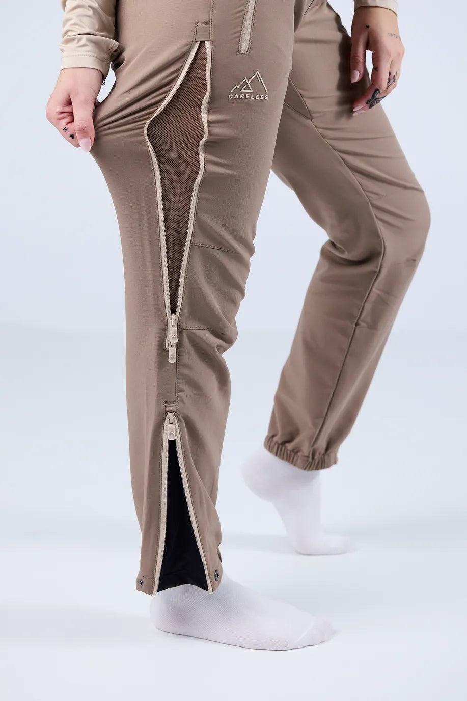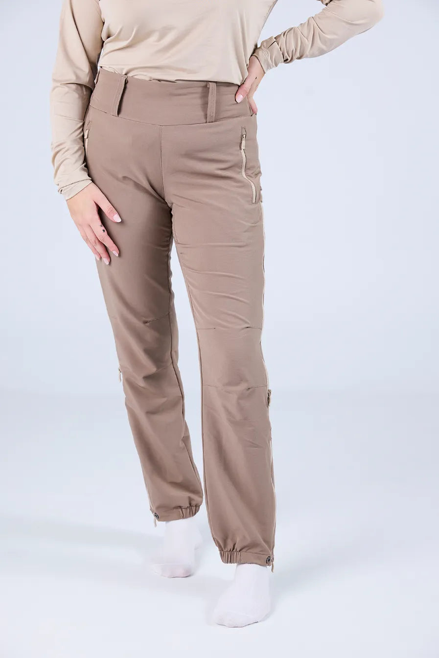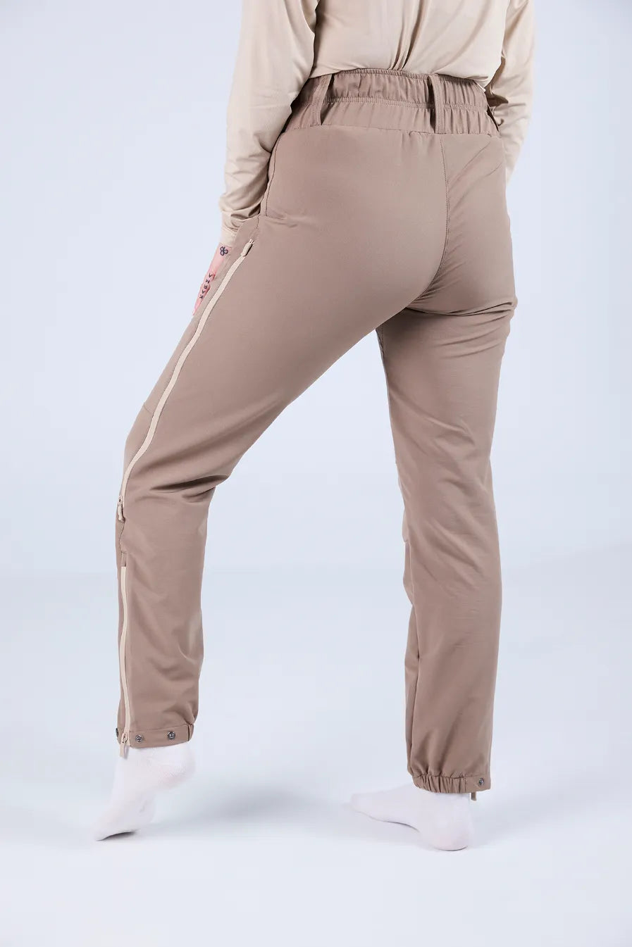 - Glidlås ved anklene foret med elastisk stoff for en større passform over sko og støvler