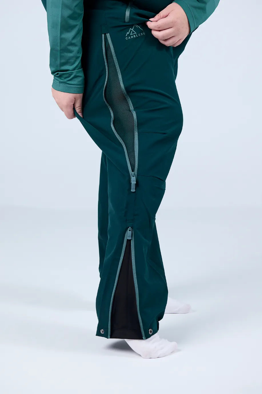 - Glidlås ved anklene foret med elastisk stoff for en større passform over sko og støvler