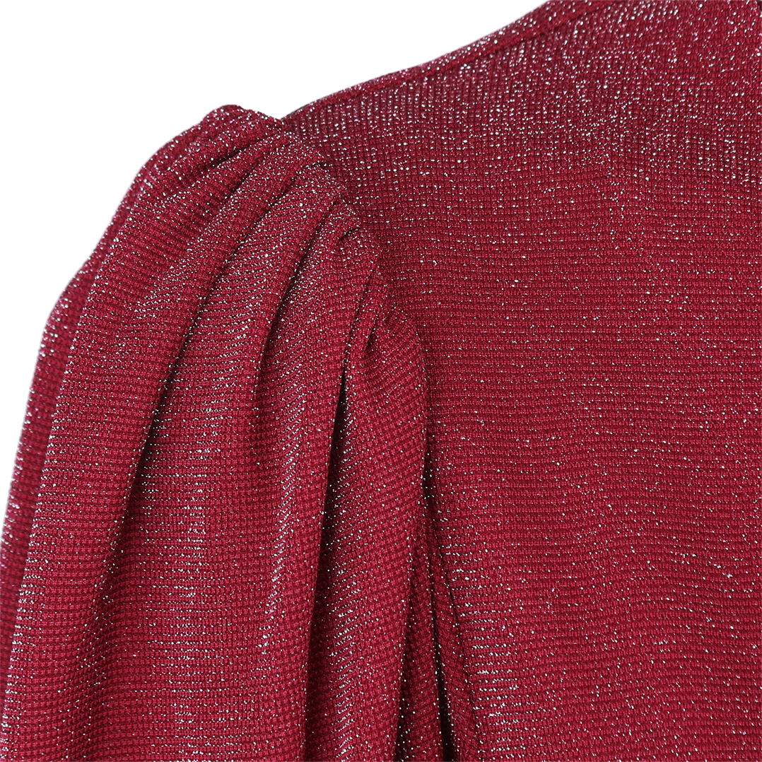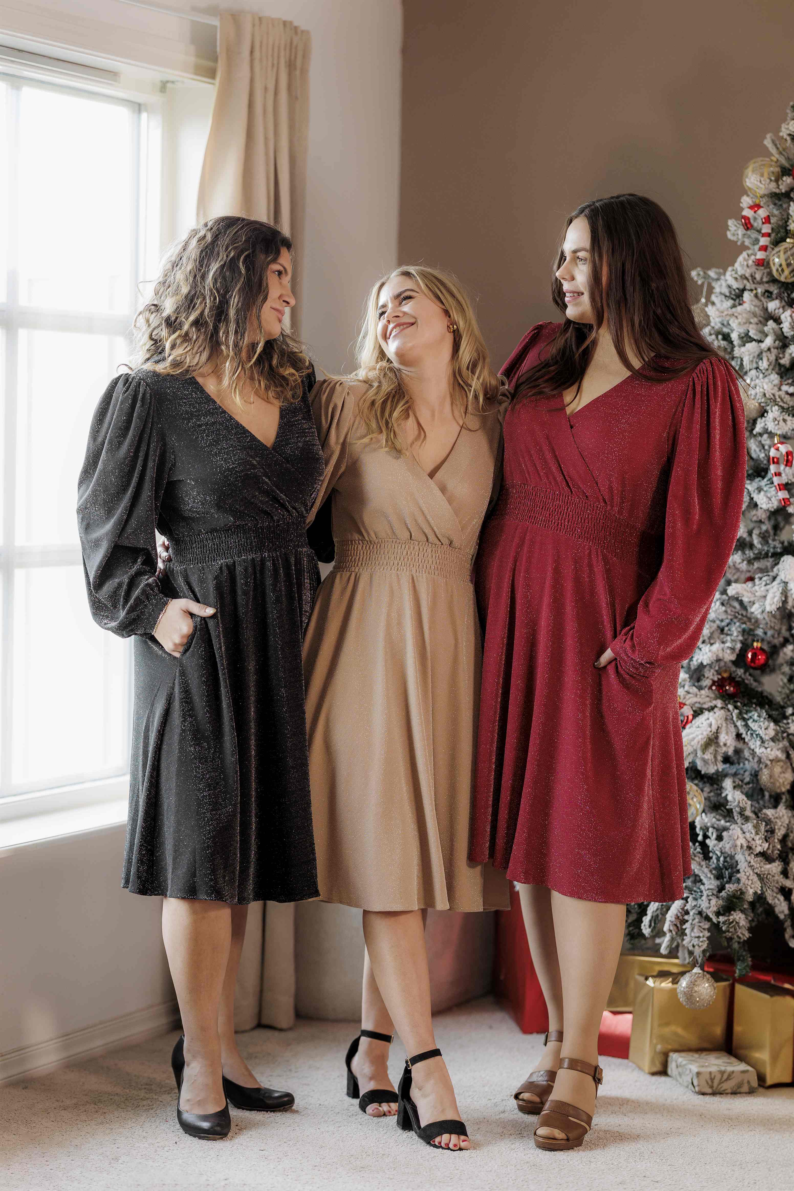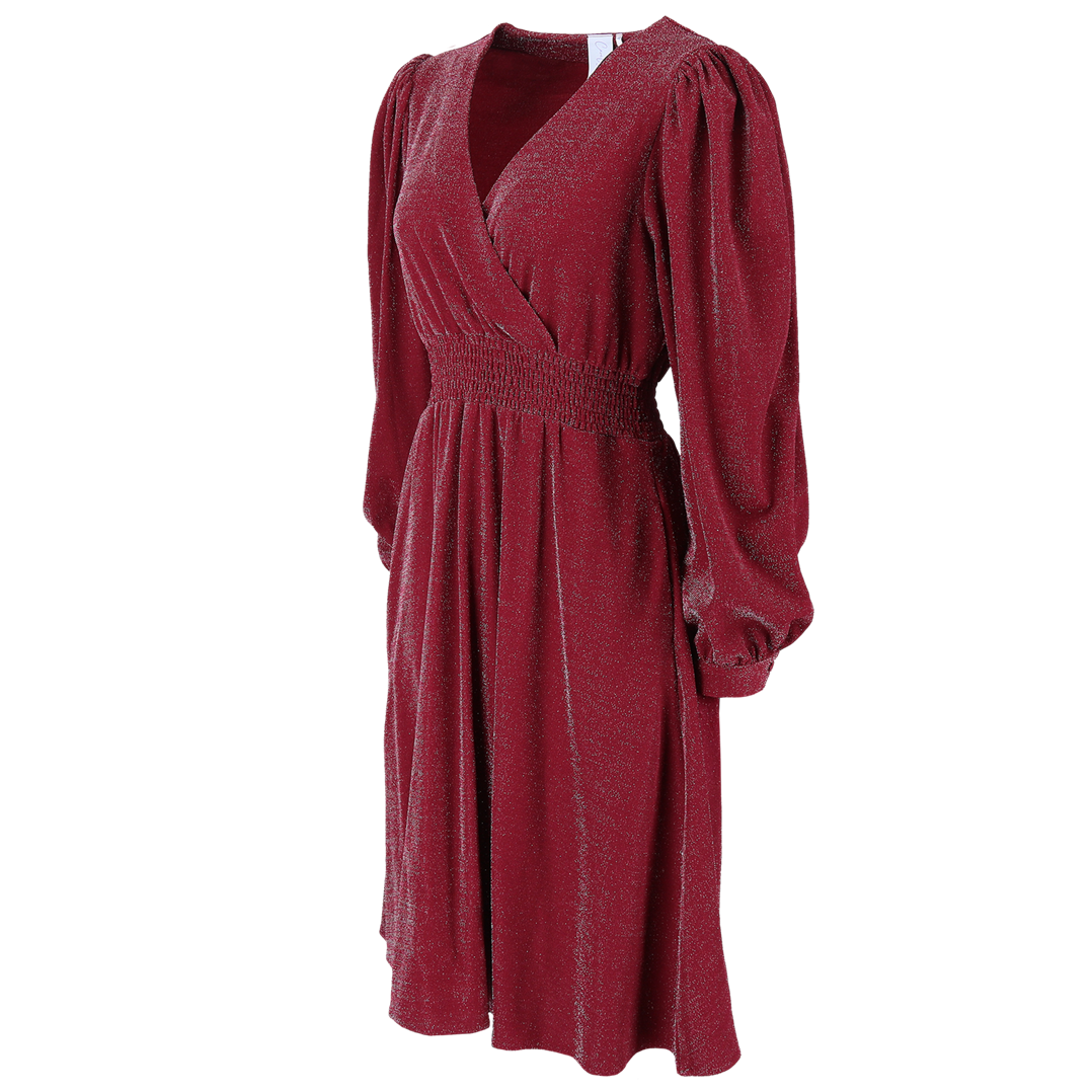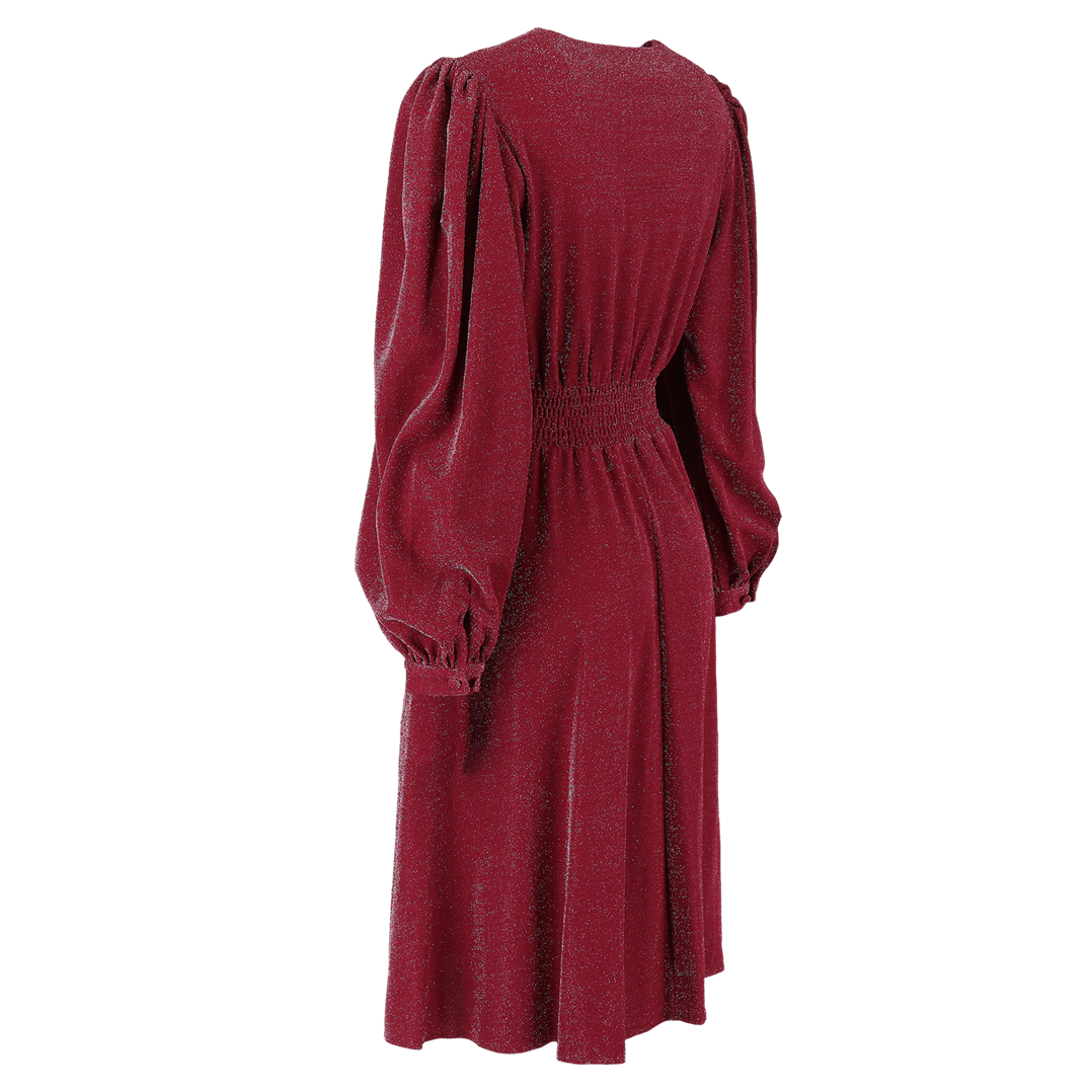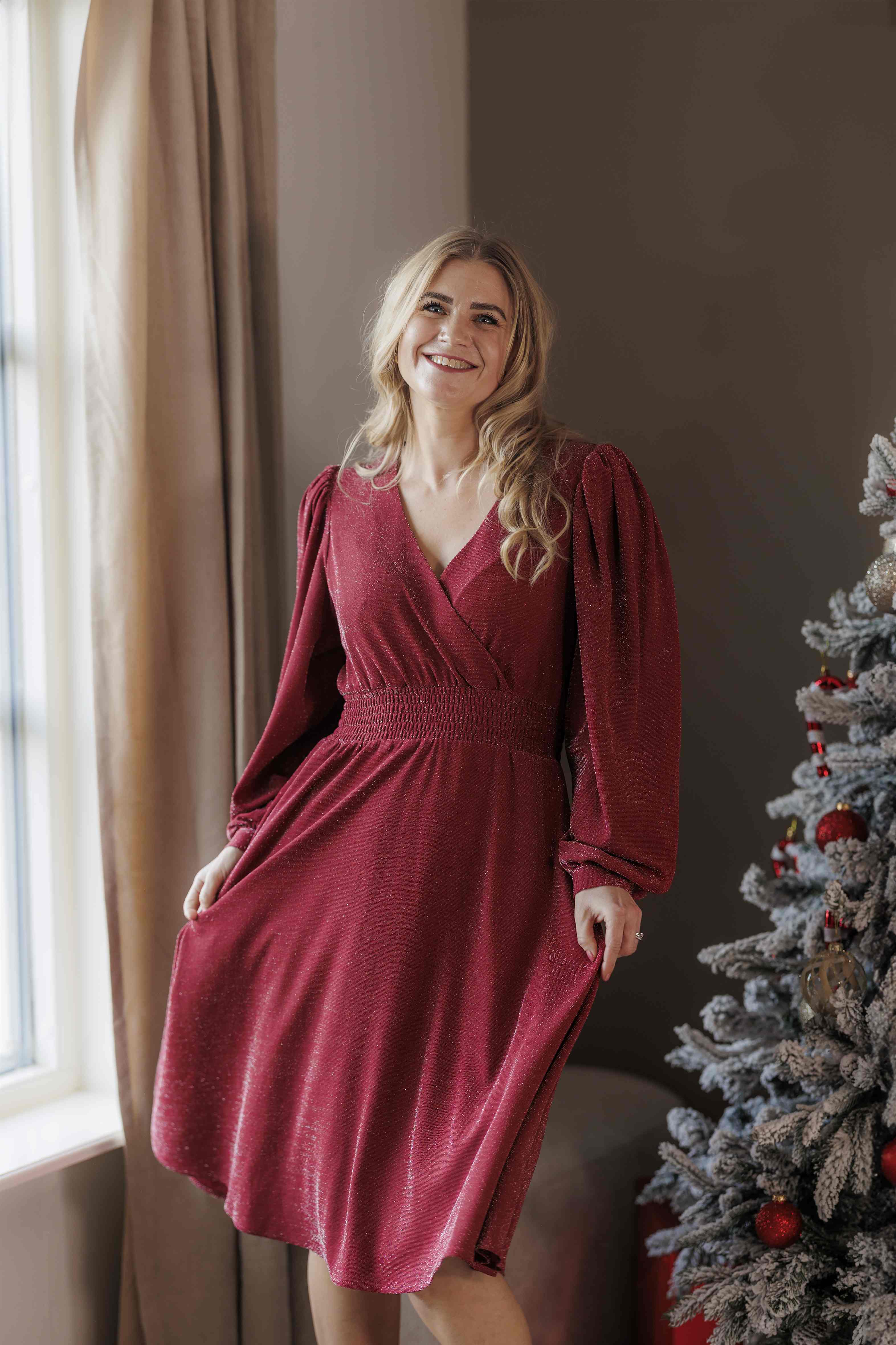 Kjolen legger seg elegant og har en komfortabel elastisk midje, i tillegg til lommer på hver side. Glitteret smitter ikke.Kjolen har nydelige detaljer i ermene med to knapper for justering ved håndledd. Oppleves som normal i størrelsen, men hvis du vipper - gå gjerne ned. Stoffet er veldig stretchy og tilpasningsdyktig, de som vipper litt i chiffon har gått ned ift denne.