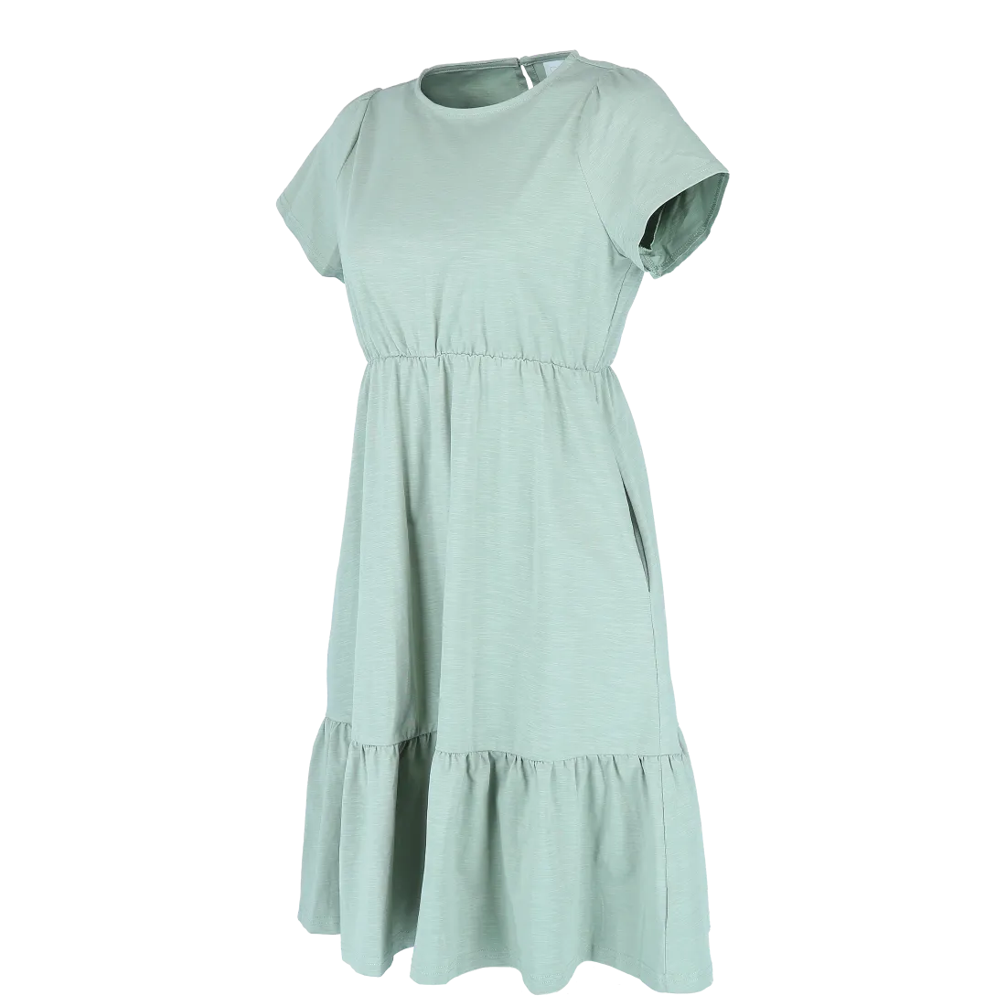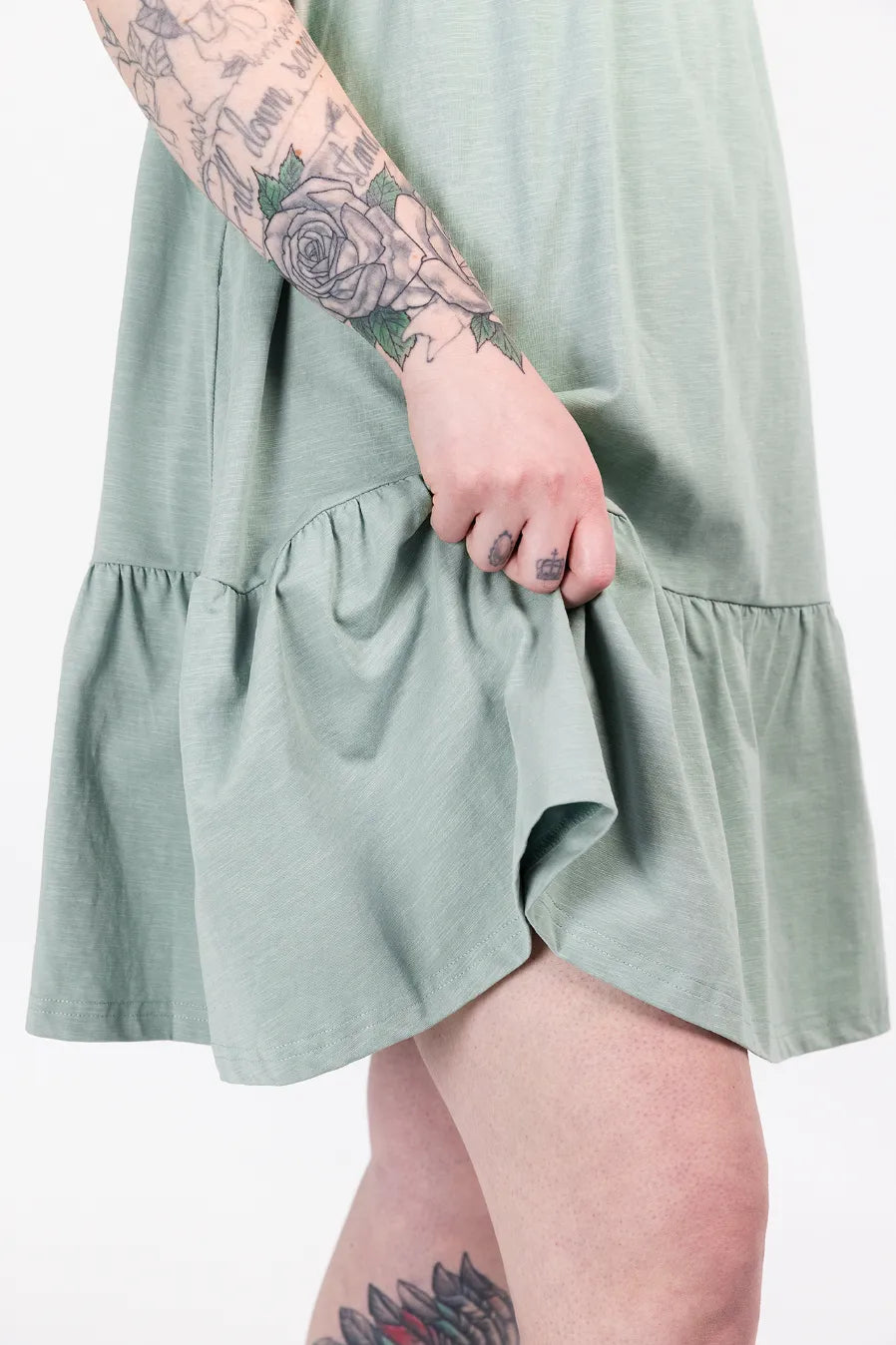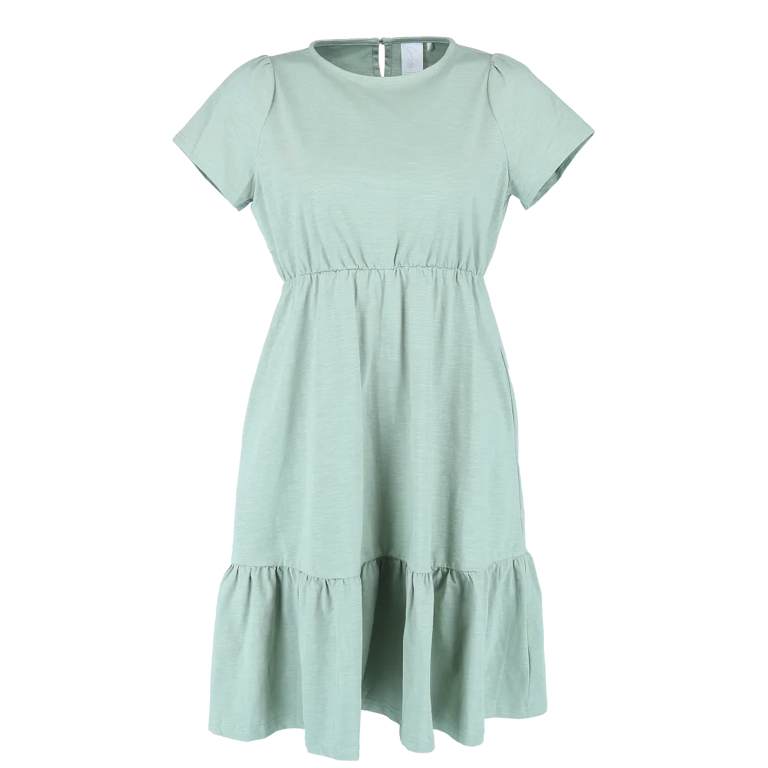 Denne kjolen har en avslappet og feminin stil, passer så godt til både hverdagsbruk og uformelle anledninger. Den er myk og behagelig, som gir en luftig og komfortabel følelse gjennom hele dagen. Kjolen har korte ermer, rund hals og en innsvinget midje med strikk som fremhever figuren på en naturlig måte. Skjørtdelen avsluttes med en bred volang som gir ekstra bevegelse og en flatterende passform.