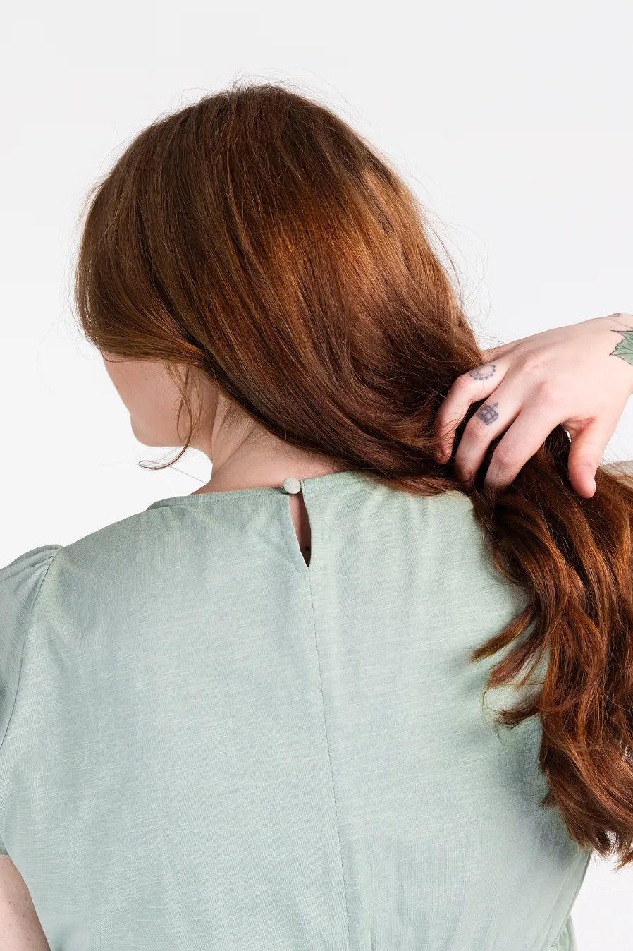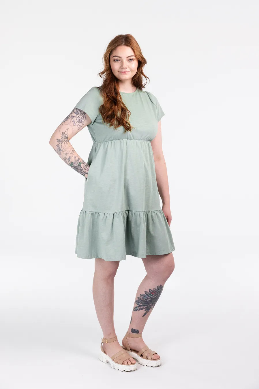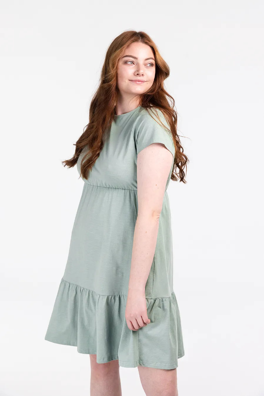 Denne kjolen har en avslappet og feminin stil, passer så godt til både hverdagsbruk og uformelle anledninger. Den er myk og behagelig, som gir en luftig og komfortabel følelse gjennom hele dagen. Kjolen har korte ermer, rund hals og en innsvinget midje med strikk som fremhever figuren på en naturlig måte. Skjørtdelen avsluttes med en bred volang som gir ekstra bevegelse og en flatterende passform.