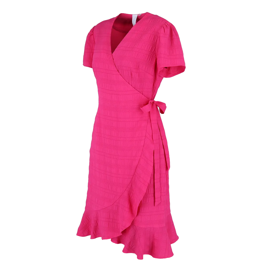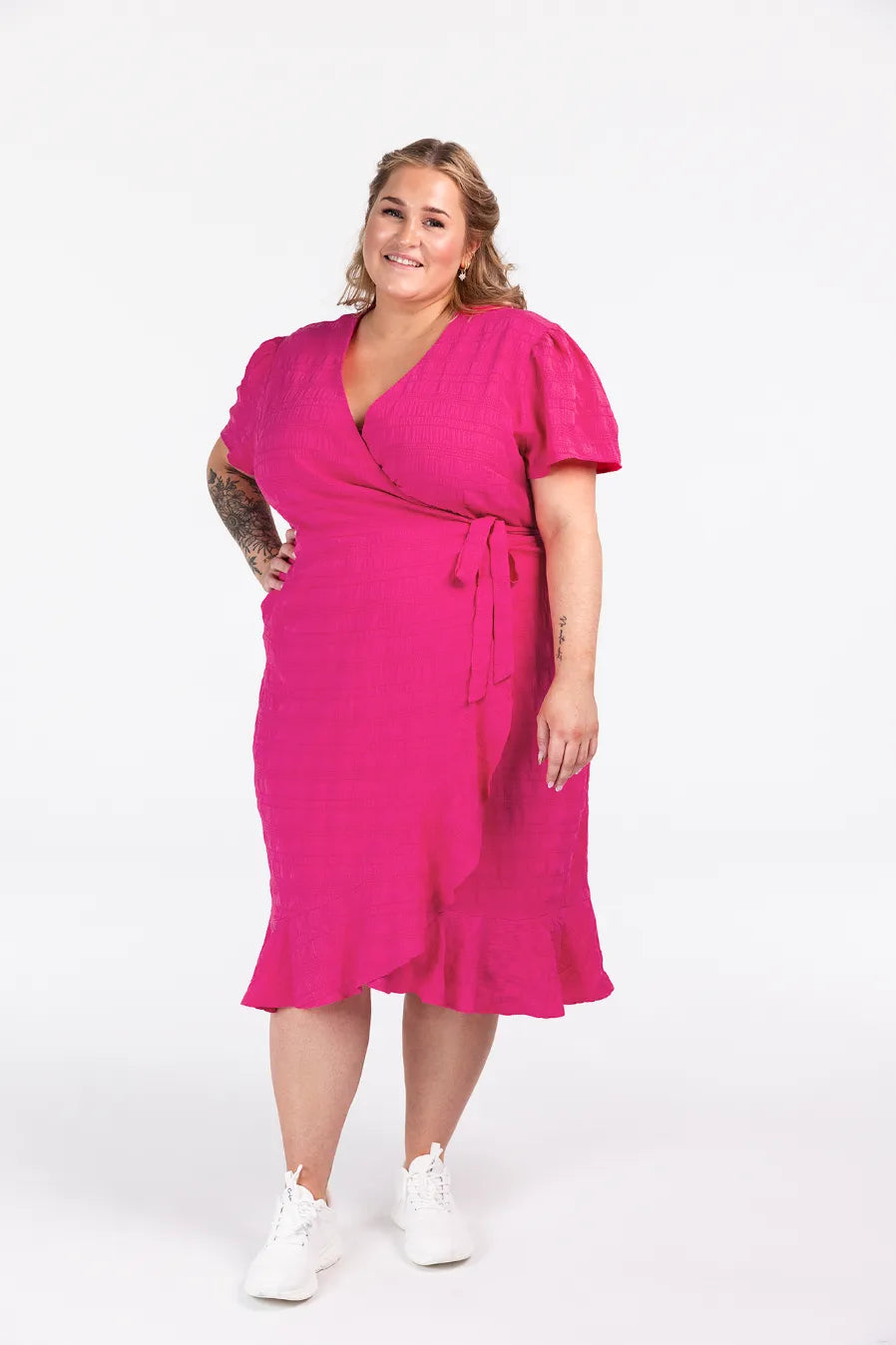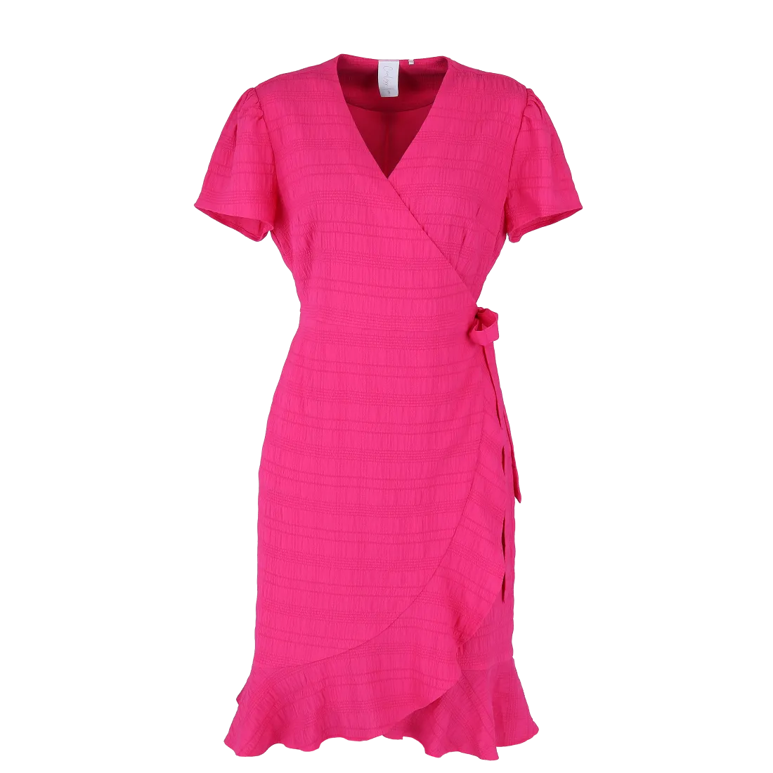 Denne omslagskjolen har en flatterende passform og sommerlig uttrykk. Den er designet med en klassisk V-utringning og korte ermer, og har knyting i siden som gir en feminin og justerbar passform. Kjolen er innsvinget i midjen og faller lett over hoftene med et skjørt som avsluttes i en myk volangkant. Dette er en kjole som passer perfekt til varme vår- og sommerdager, enten du skal på piknik, i selskap eller bare ønsker et behagelig og fint antrekk til hverdagen.