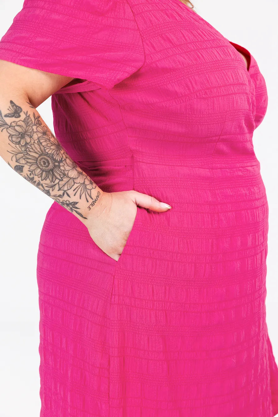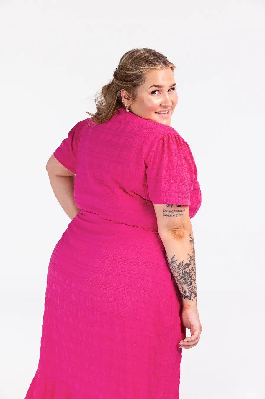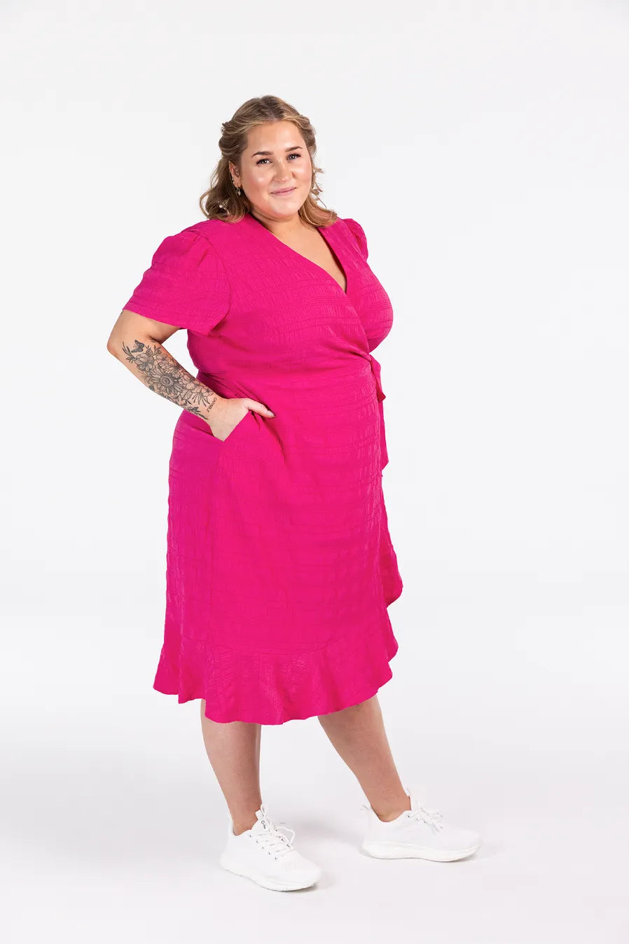 Denne omslagskjolen har en flatterende passform og sommerlig uttrykk. Den er designet med en klassisk V-utringning og korte ermer, og har knyting i siden som gir en feminin og justerbar passform. Kjolen er innsvinget i midjen og faller lett over hoftene med et skjørt som avsluttes i en myk volangkant. Dette er en kjole som passer perfekt til varme vår- og sommerdager, enten du skal på piknik, i selskap eller bare ønsker et behagelig og fint antrekk til hverdagen.