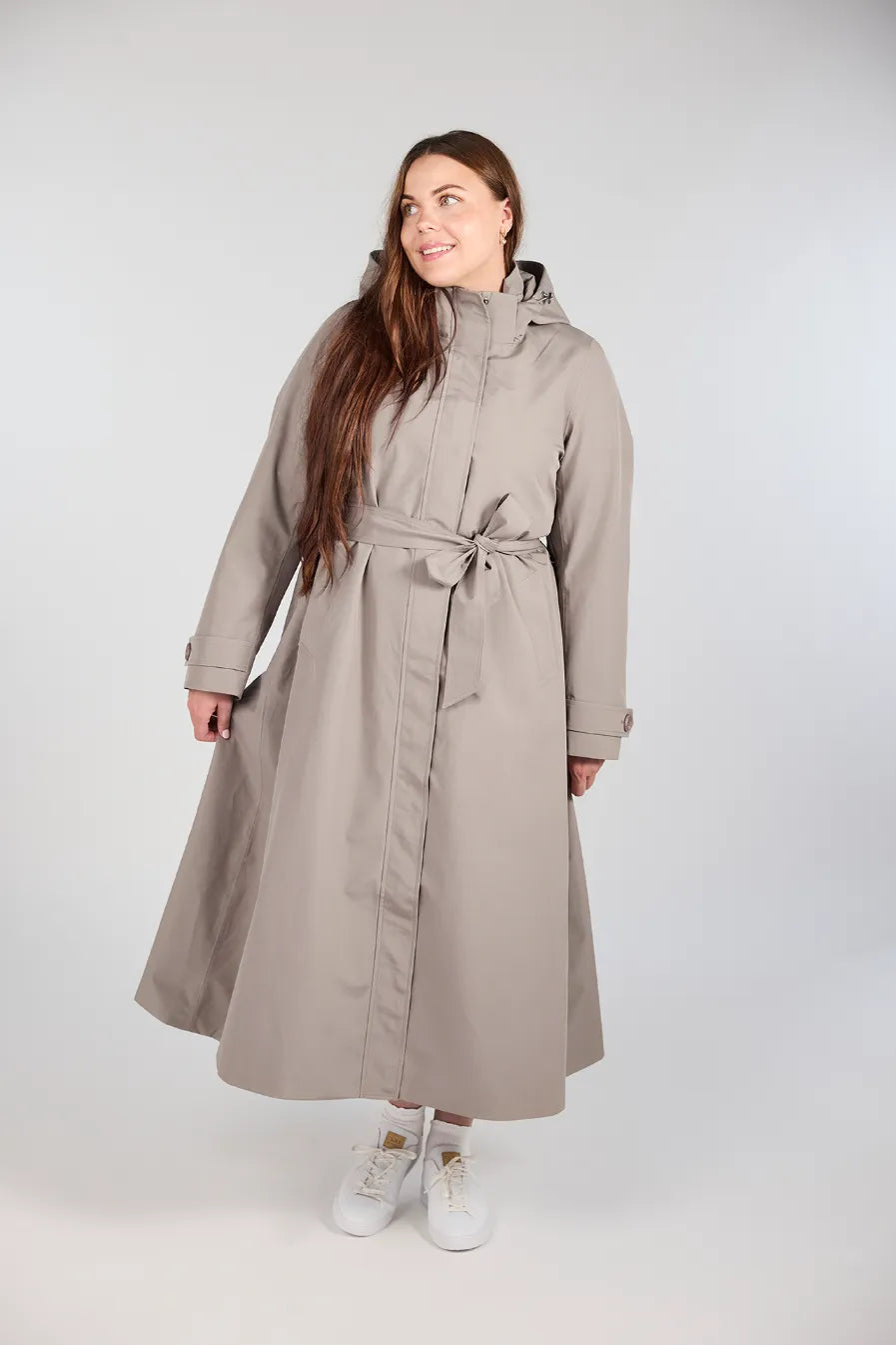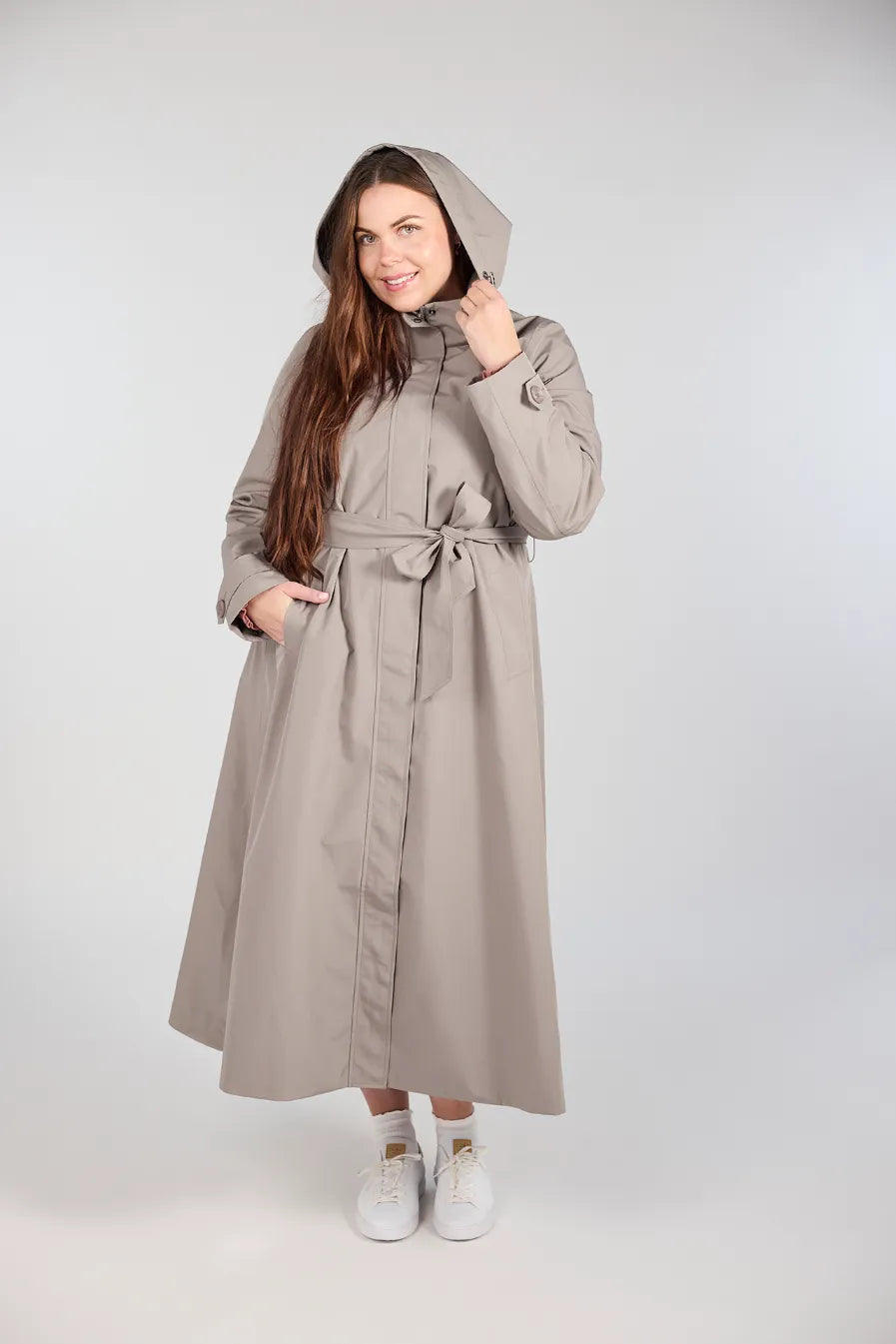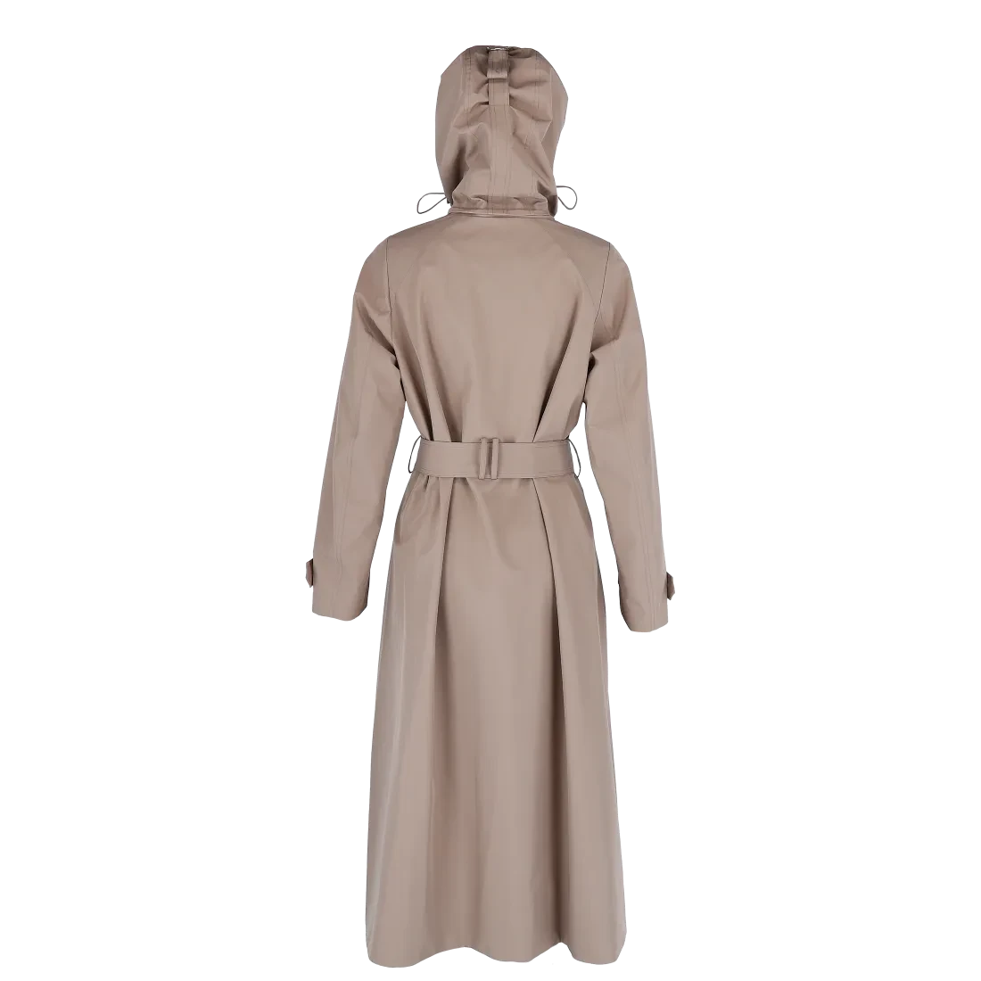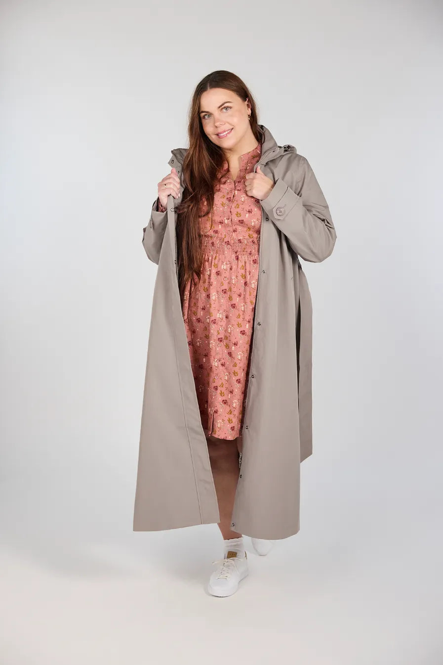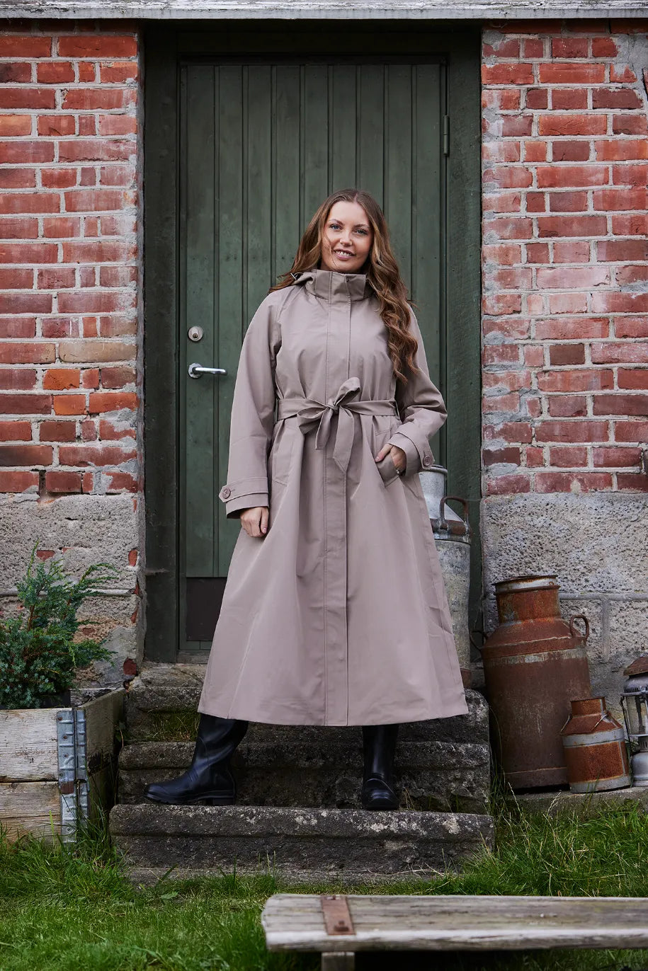 Denne regnjakken kombinerer et tidløst snitt med feminine detaljer. Den har justerbar hette, belte i livet som fremhever fasongen og praktiske lommer. Ermene avsluttes med stropper og knapp, og den lange lengden gir en gir god dekning.