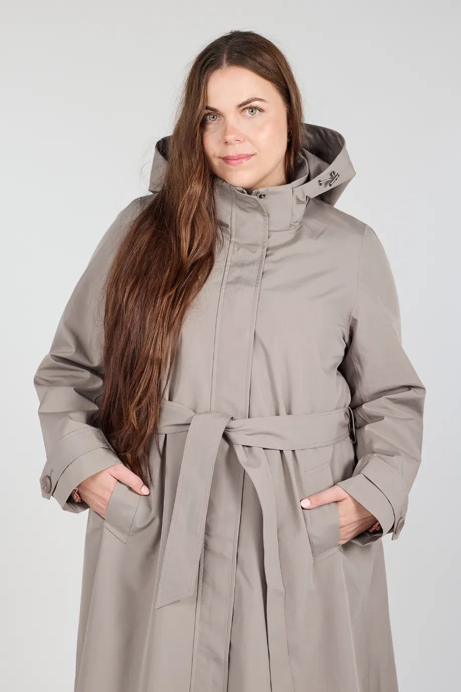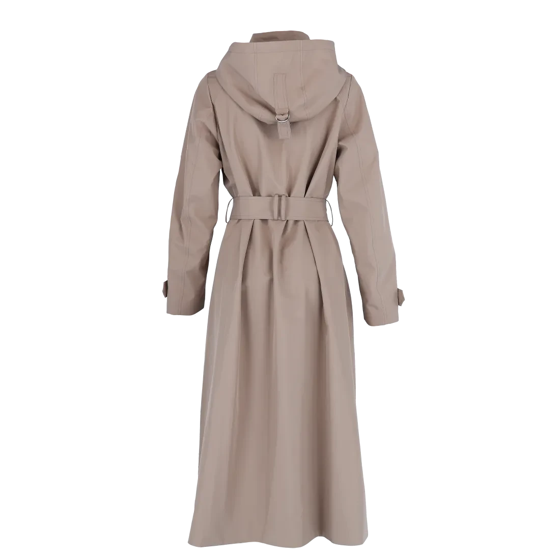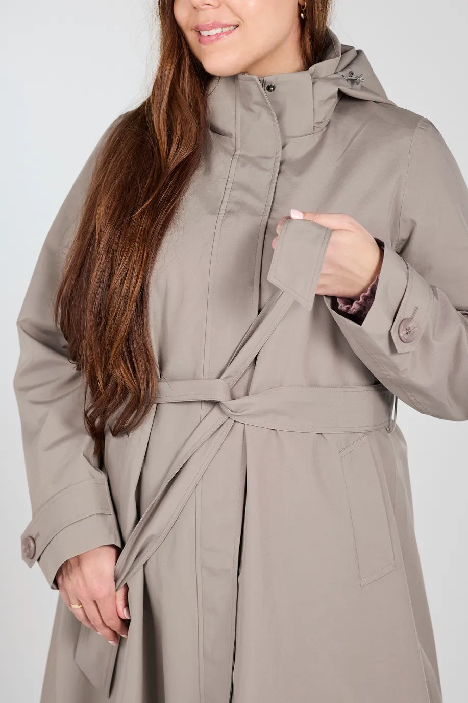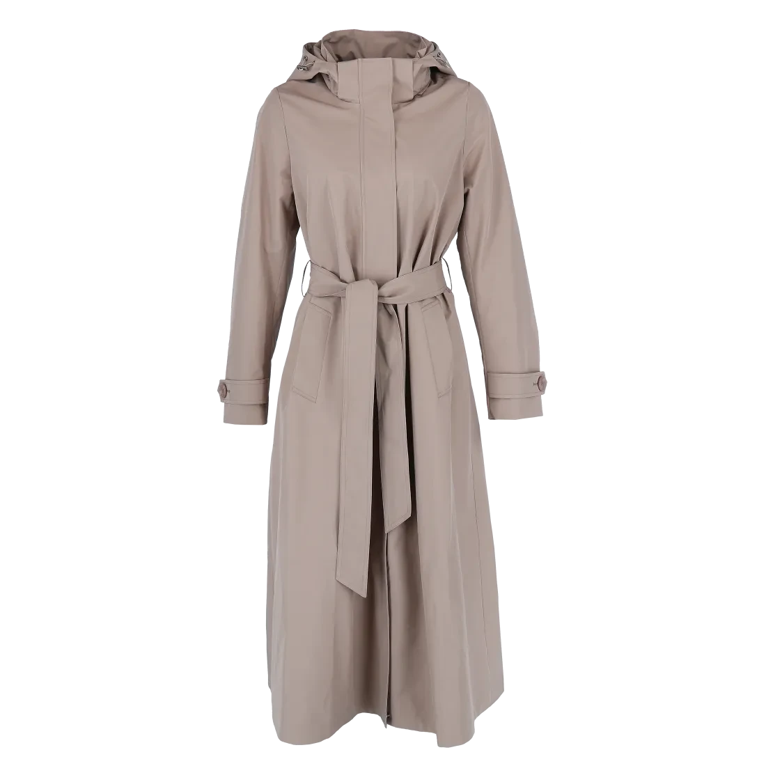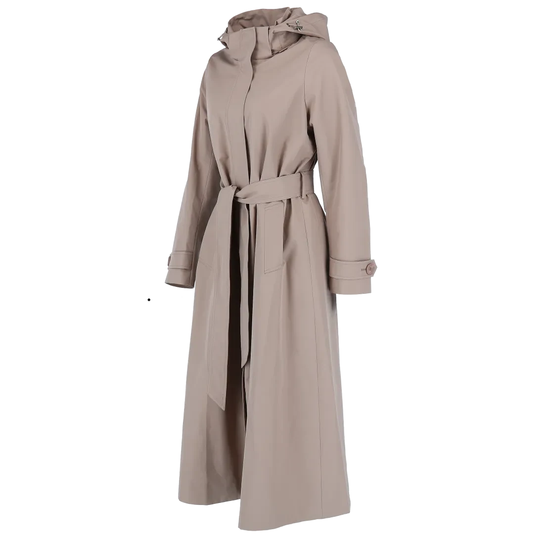Denne regnjakken kombinerer et tidløst snitt med feminine detaljer. Den har justerbar hette, belte i livet som fremhever fasongen og praktiske lommer. Ermene avsluttes med stropper og knapp, og den lange lengden gir en gir god dekning.