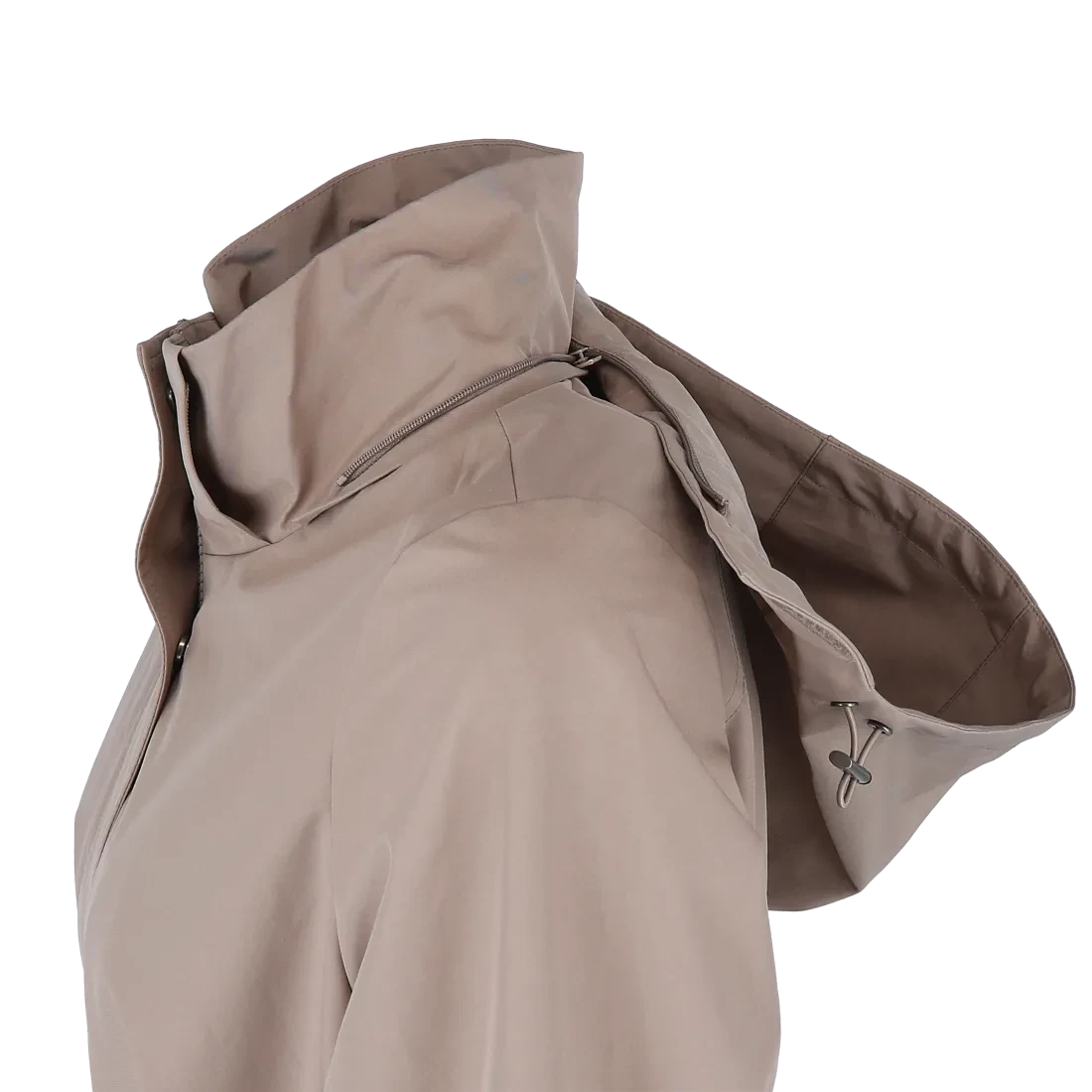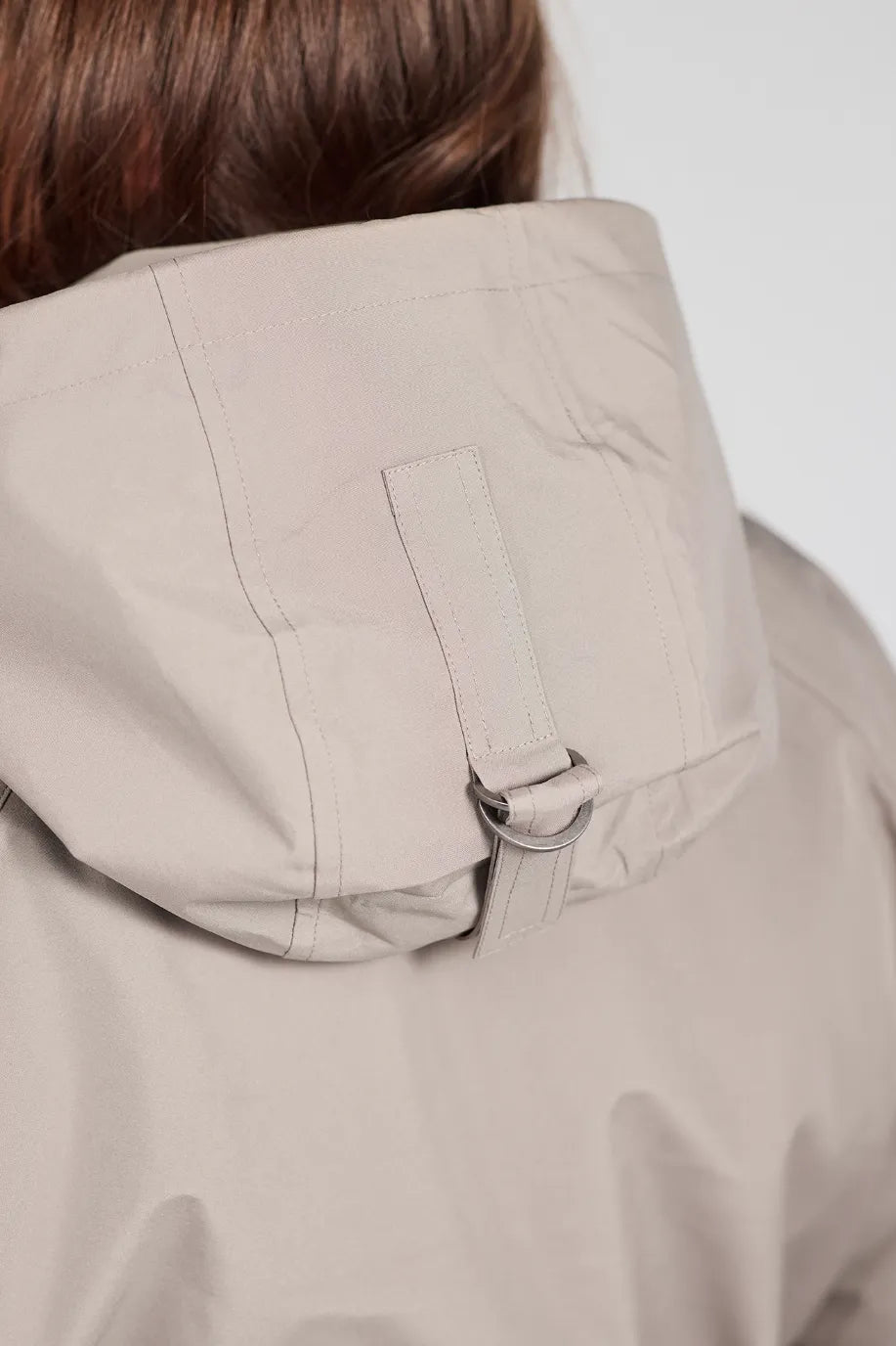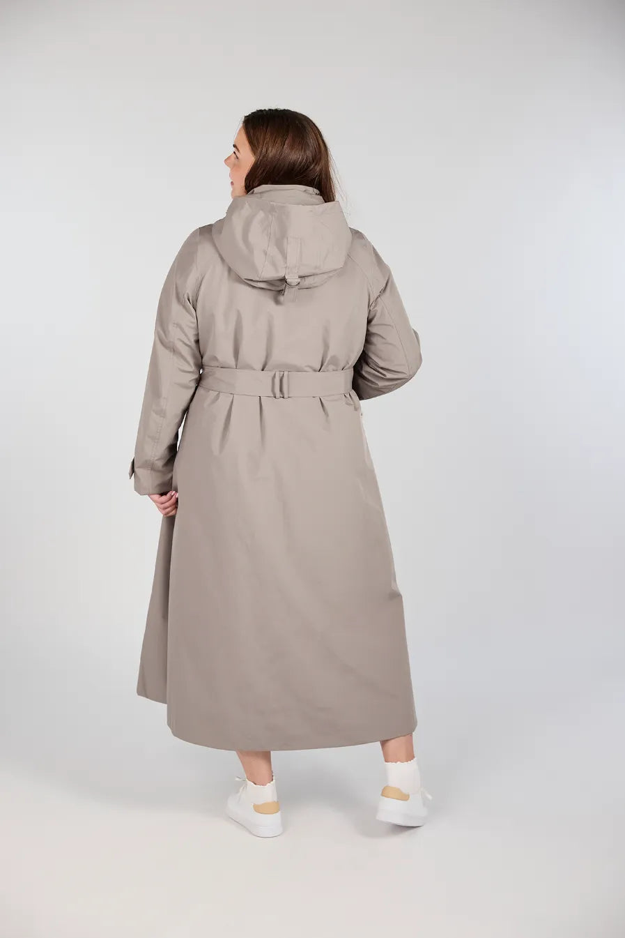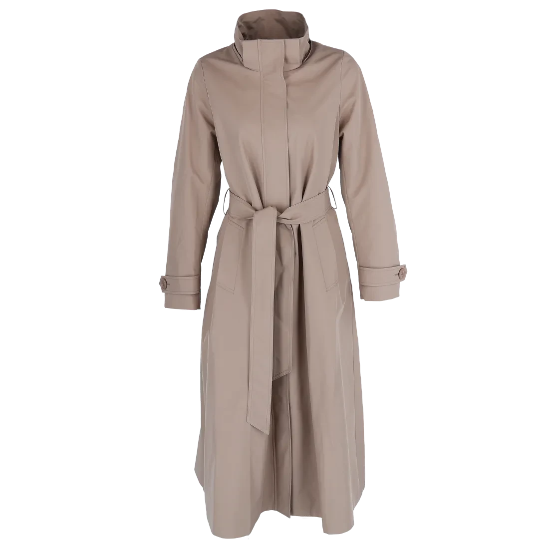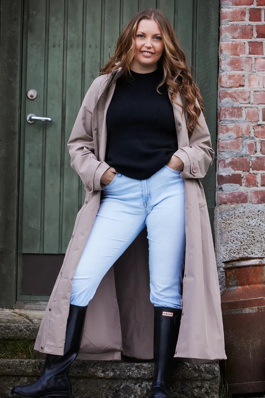 Denne regnjakken kombinerer et tidløst snitt med feminine detaljer. Den har justerbar hette, belte i livet som fremhever fasongen og praktiske lommer. Ermene avsluttes med stropper og knapp, og den lange lengden gir en gir god dekning.